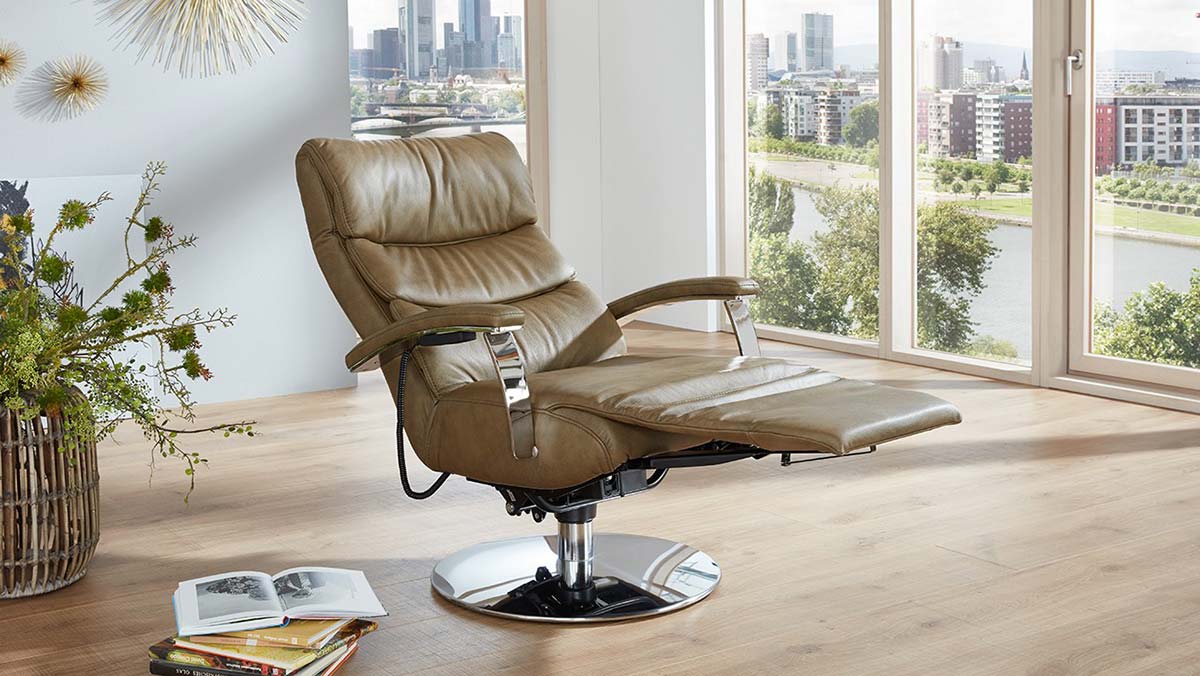 - Relaxsessel CR.485: Mit klarer Form, Höhenverstellung und Wippmechanismus wird dieser Sessel zum stilvollen Rückzugsort. Der passende Hocker rundet das Komforterlebnis ab.