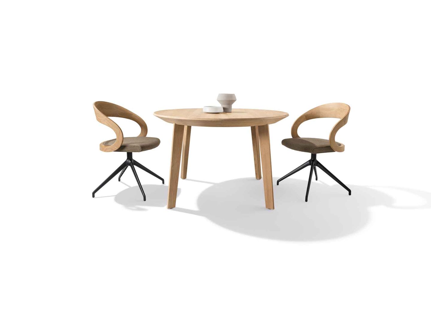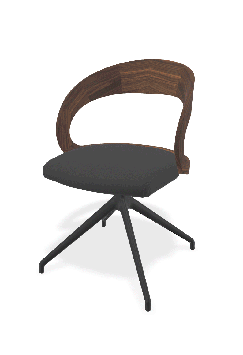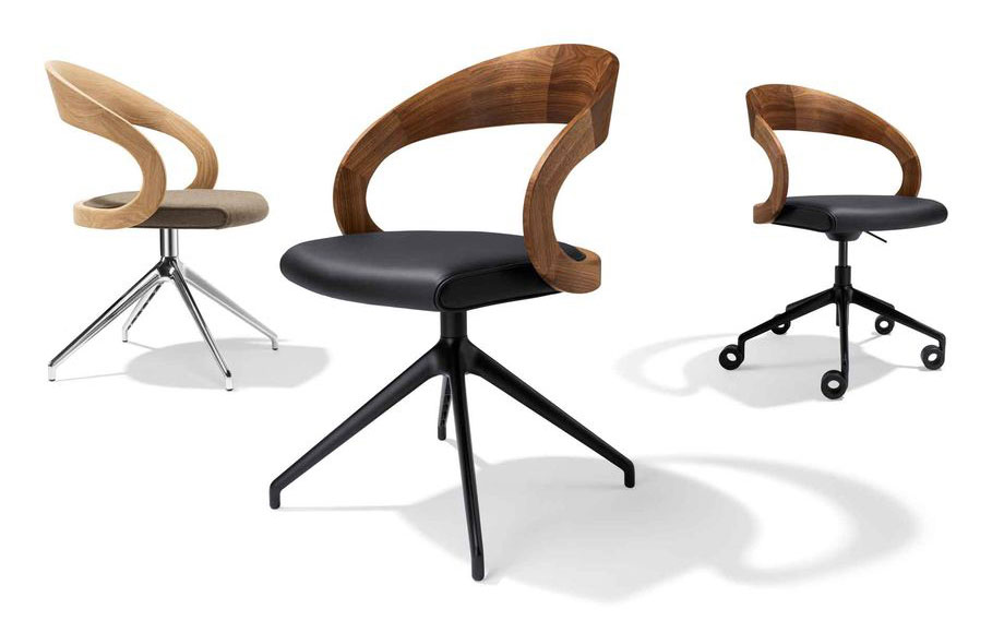 - «Girado» ist ein Stuhl, der alles andere als langweilig ist: Mit seiner kunstvoll geschwungenen Rückenlehne aus Massivholz und dem luftigen Drehgestellt ist er optisch ein echter Hingucker. Die Form schmiegt sich zudem perfekt an den Oberkörper an, gibt Halt und unterstützt damit komfortable Sitzpositionen. Ausserdem können Sie beim Bezug aus vielen verschiedenen Stoff- und Lederfarben wählen: Grasgrün, Bordeaux, Nachtblau, Zartrosa, gedecktes Gau oder Senfgelb – ob dezent oder Farbtupfer, Sie haben’s in der Hand.